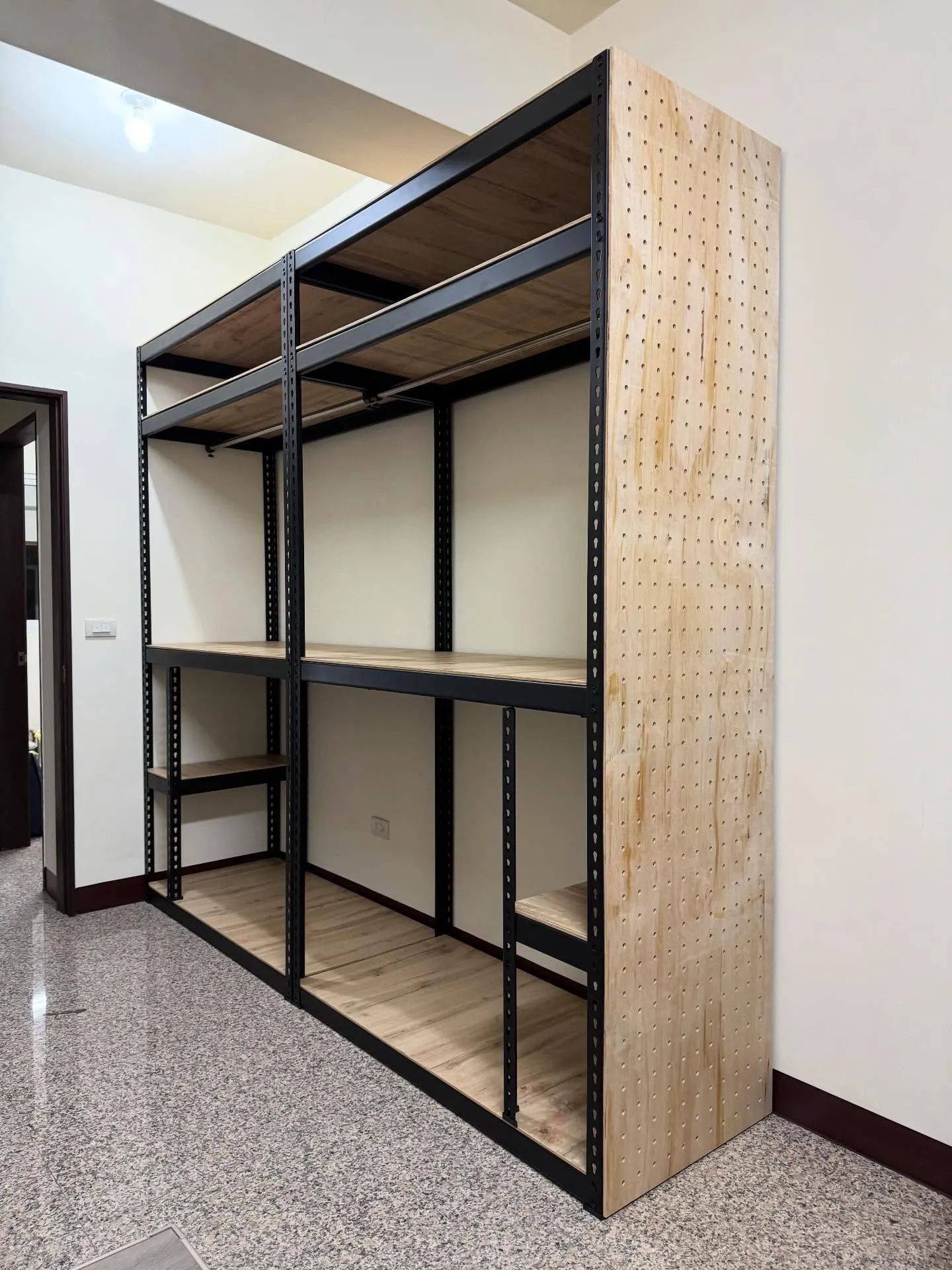 黑色工業風角鋼 + 歐洲白橡8mm貼皮系統板 組合而成, 搭配 洞洞板側牆,讓整體收納功能更完整、視覺更整潔。
